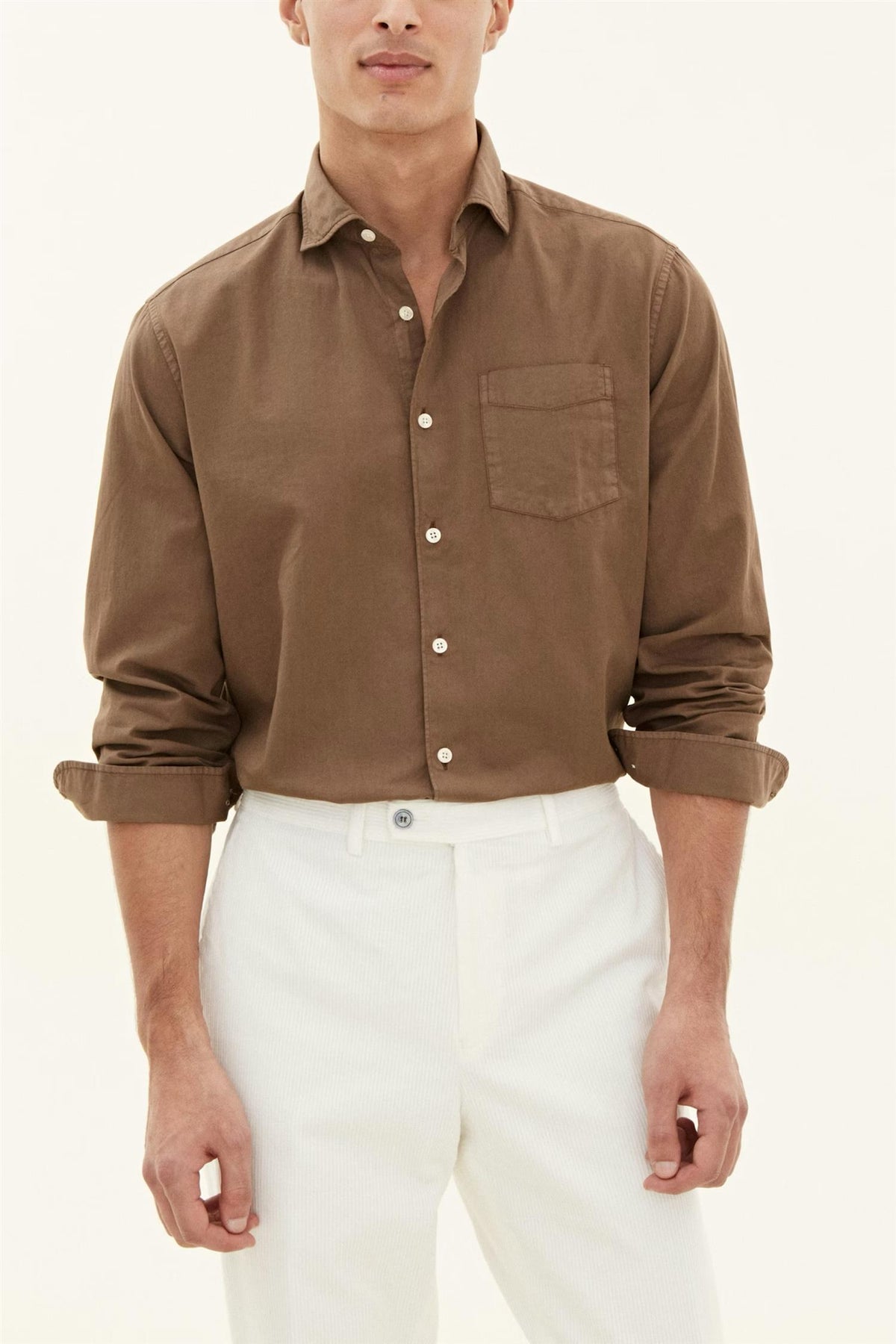 Den brede spredte kragen og enkle brystlommen gir et klassisk uttrykk som er lett å style opp eller ned.