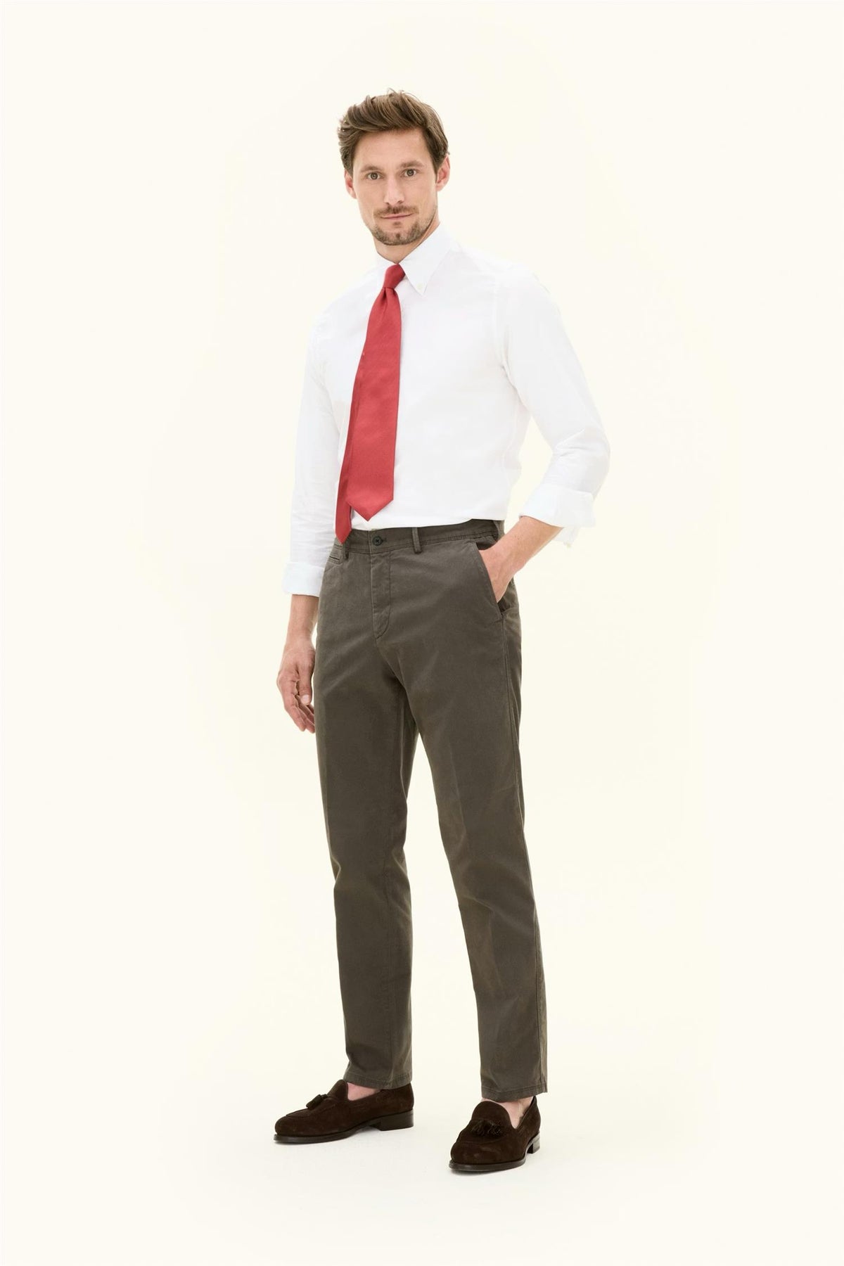 Den vevde konstruksjonen med elegant twill-stretchtekstur gir et rent og tidløst uttrykk – like passende til hverdags som til jobb eller en kveld ute. Det ensfargede designet gjør buksene enkle å style med både skjorte, genser eller t-skjorte.